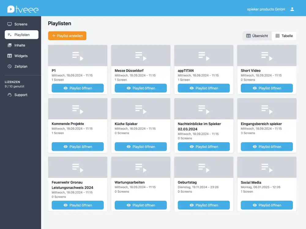 Erstelle flexible Playlisten, um deine Inhalte optimal zu präsentieren. Plane die Wiedergabe nach Zeit, Wochentag oder Standort und passe deine Botschaften jederzeit an. Lasse tveee deine Inhalte zur richtigen Zeit am richtigen Ort abspielen.